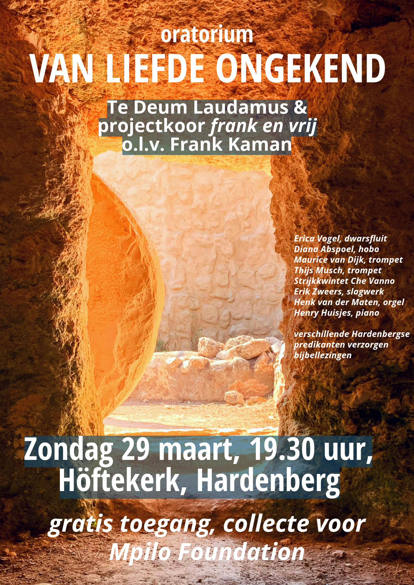 De koorzang wordt uitgevoerd door gemengd koor Te Deum Laudamus uit Hardenberg en projectkoor frank en vrij. De muzikale begeleiding is in handen van gerenommeerde musici: Erica Vogel (dwarsfluit), Diana Abspoel (hobo), Maurice van Dijk (trompet), Thijs Musch (trompet), Strijkkwintet Che Vanno, Erik Zweers (slagwerk), Henk van der Maten (orgel) en Henry Huisjes (piano). Het geheel staat onder leiding van dirigent Frank Kaman.